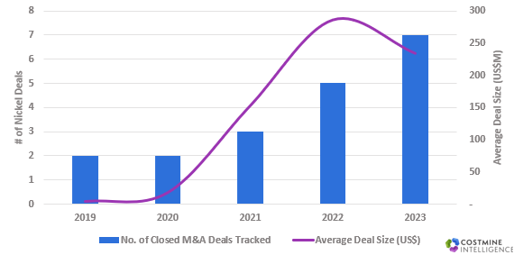 During the pandemic, the enthusiasm for Energy Transition metals surged, notably in the case of nickel. Despite nickel’s price remaining stable, comparable to 2021 levels, there has been a dramatic increase in both the number of deals and, importantly, the average value of these transactions.