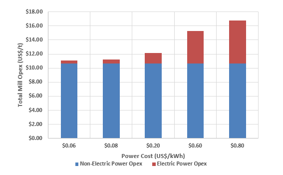 Using Costmine’s Sherpa Mineral Processing cost model to isolate the electric power consumed, the chart below makes it clear that the cost of electricity at mills can make or break many projects. As shown, prices above US$0.20/kWh makes power a significant portion of a mill’s opex.