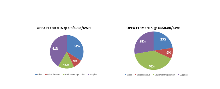 The following charts compare the impact on the relative importance of each cost element as power prices increase from $0.08/kWh to $0.80kWh. As rates increase, it brings into sharp relief the equipment opex for furnaces, crushers, grinders and other power intensive processes.